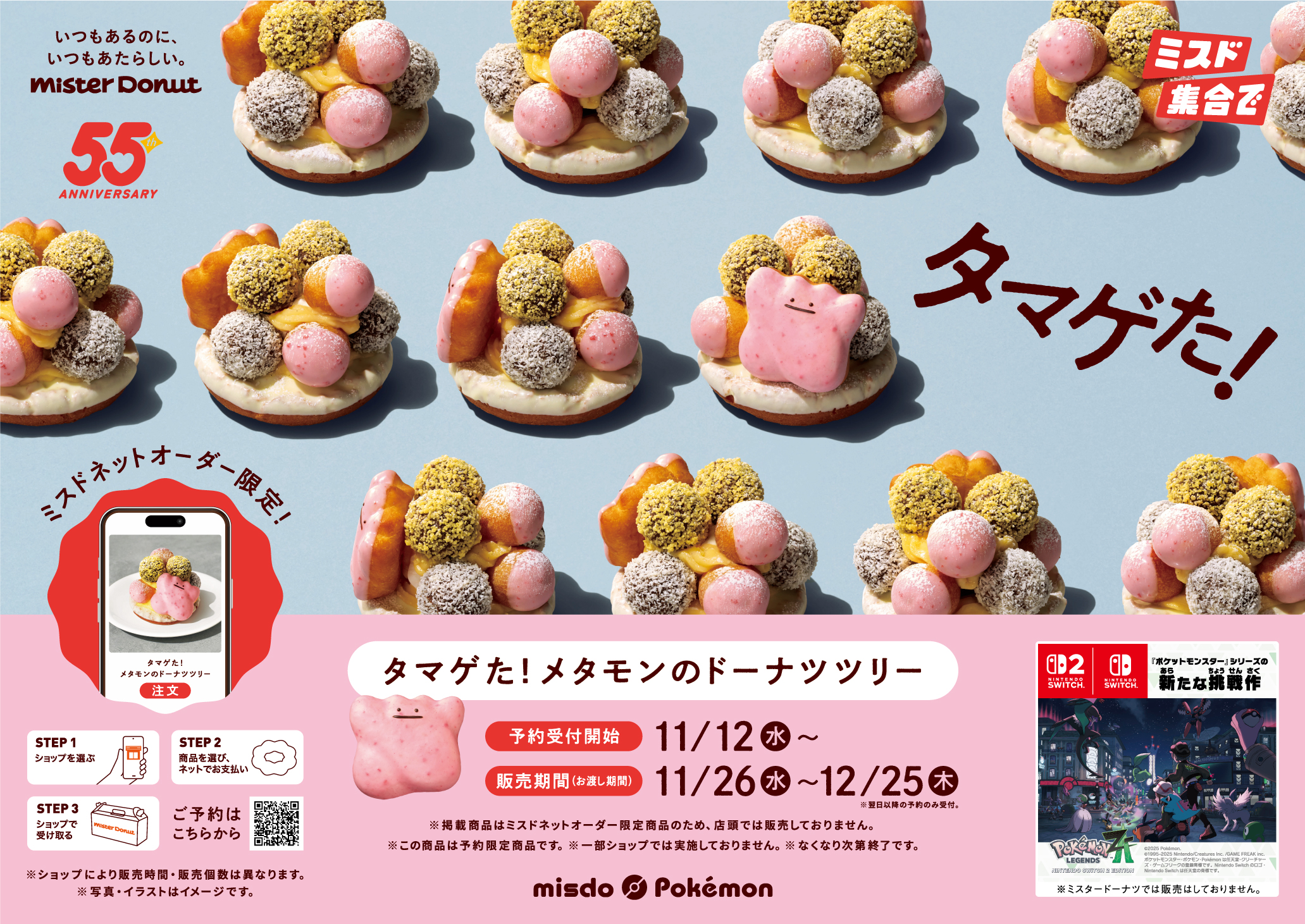 ミスタードーナツは、株式会社ポケモンとのコラボレーションによる新作スイーツ『タマゲた! メタモンのドーナツツリー』を、2025年11月26日(水)から期間限定で販売します。本商品は、同社の55周年を記念した特別なアイテムで、ネット注文限定で提供されます。