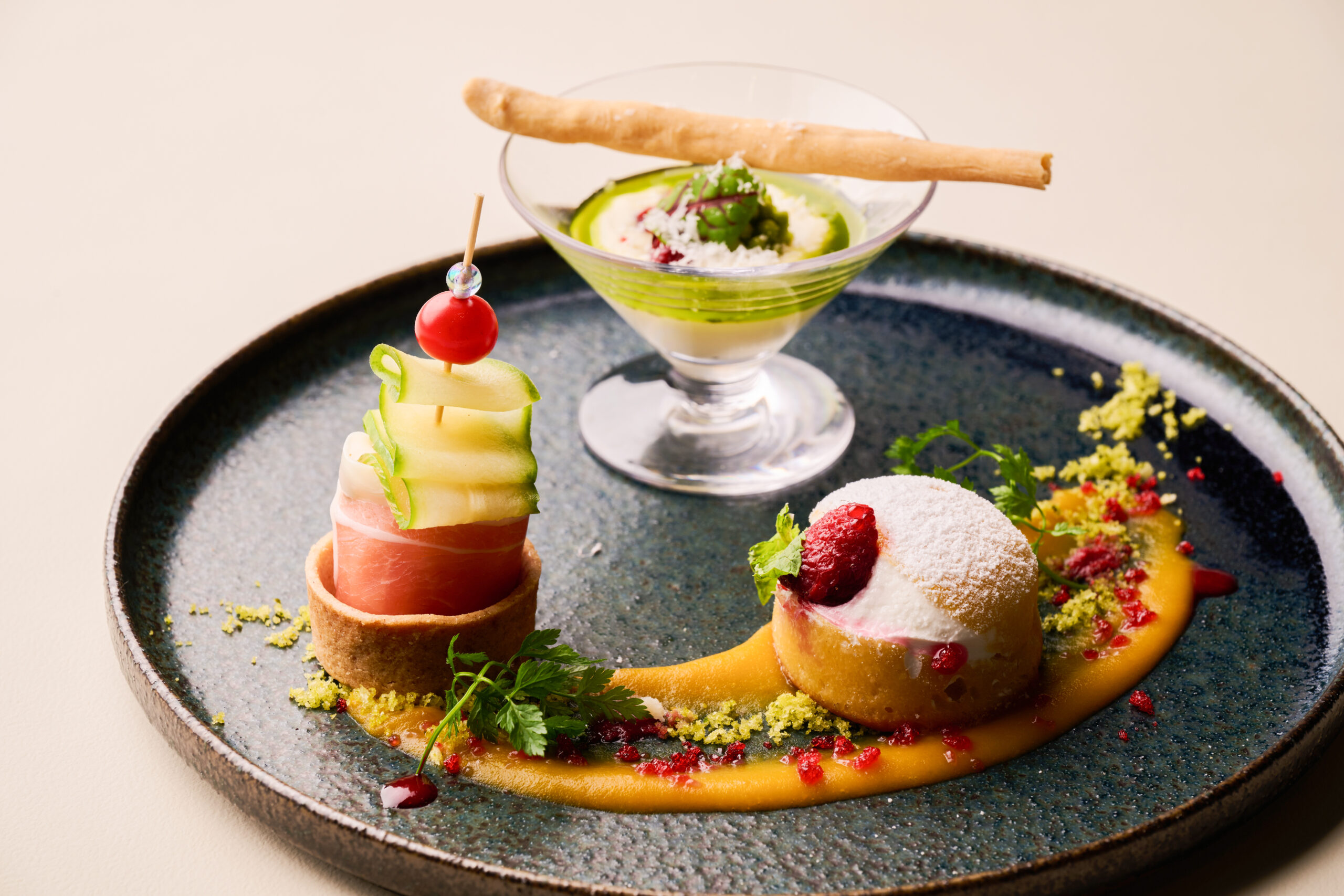 最上段のセイボリープレートでは、冬の森をテーマにしたフルーツサンドやミニタルトが登場。さらに、目の前でパルメザンチーズを削る“粉雪パフォーマンス”も楽しめ、五感で冬の訪れを感じられる演出が施されています。