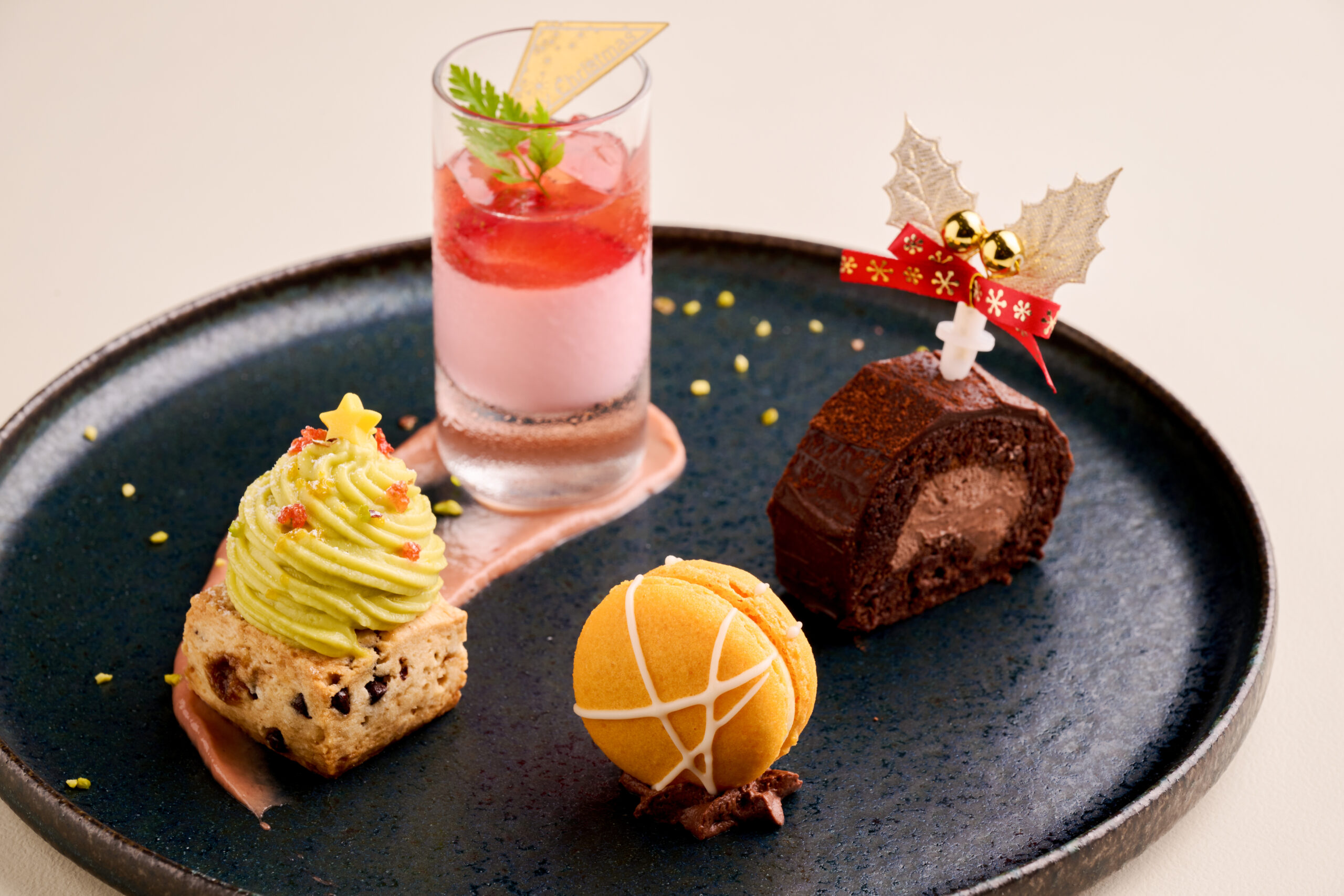 そして最下段のペストリーでは、艶やかなフランボワーズムースの“サンタ帽子”、可愛らしい“トナカイのチョコムースタルト”、プレゼント型のチーズケーキが登場。まるで物語のワンシーンのような、心躍るラインナップです。