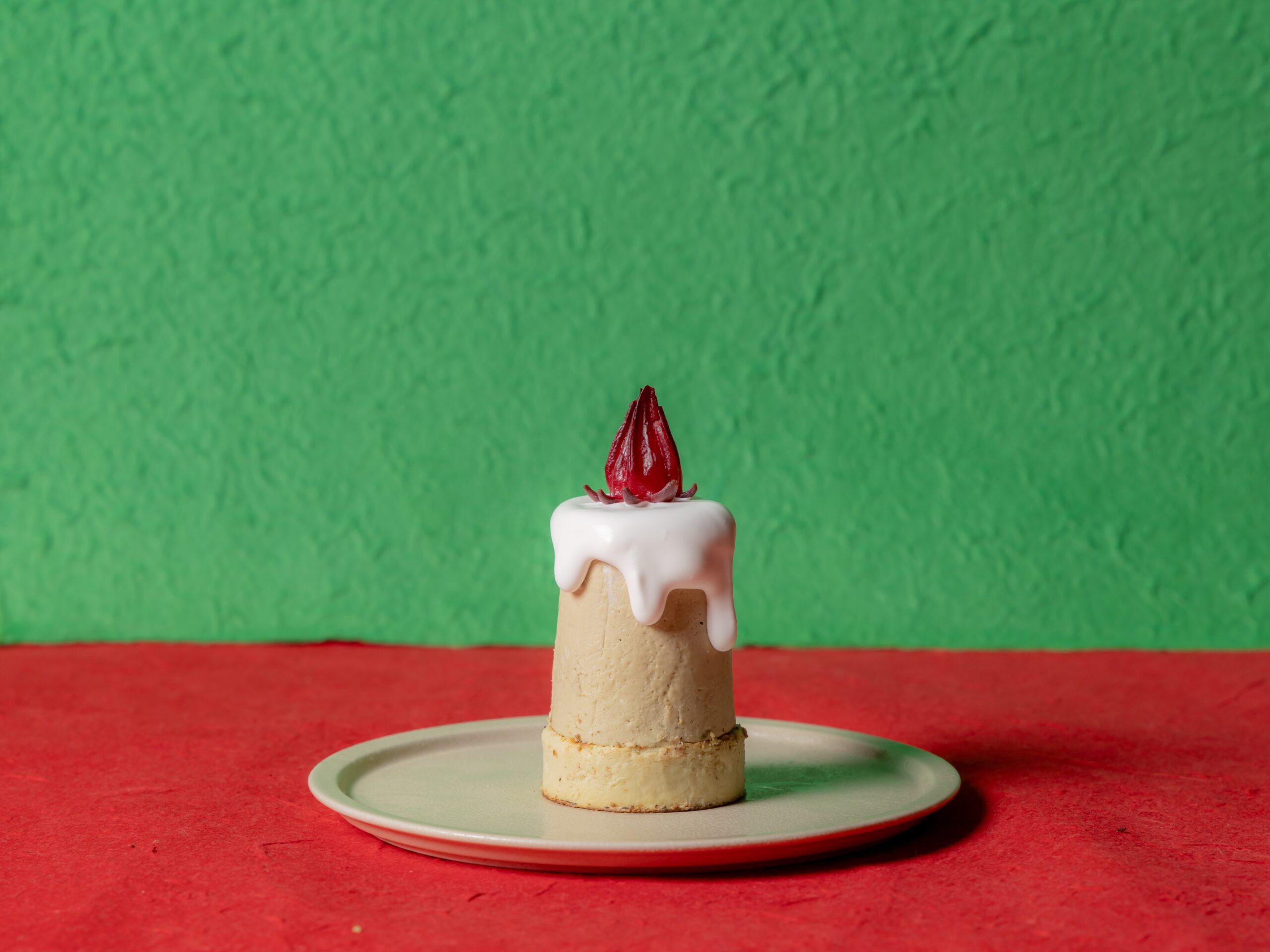 主役は沖縄で親しまれてきたハーブ「フーチバー(ニシヨモギ)」。爽やかな香りとまろやかな苦味を活かした「フーチバーキャンドルケーキ」は、バスクチーズとレアチーズの二層仕立てに月桃香るクリームを添え、ローゼルでキャンドルの灯を演出した一品です。