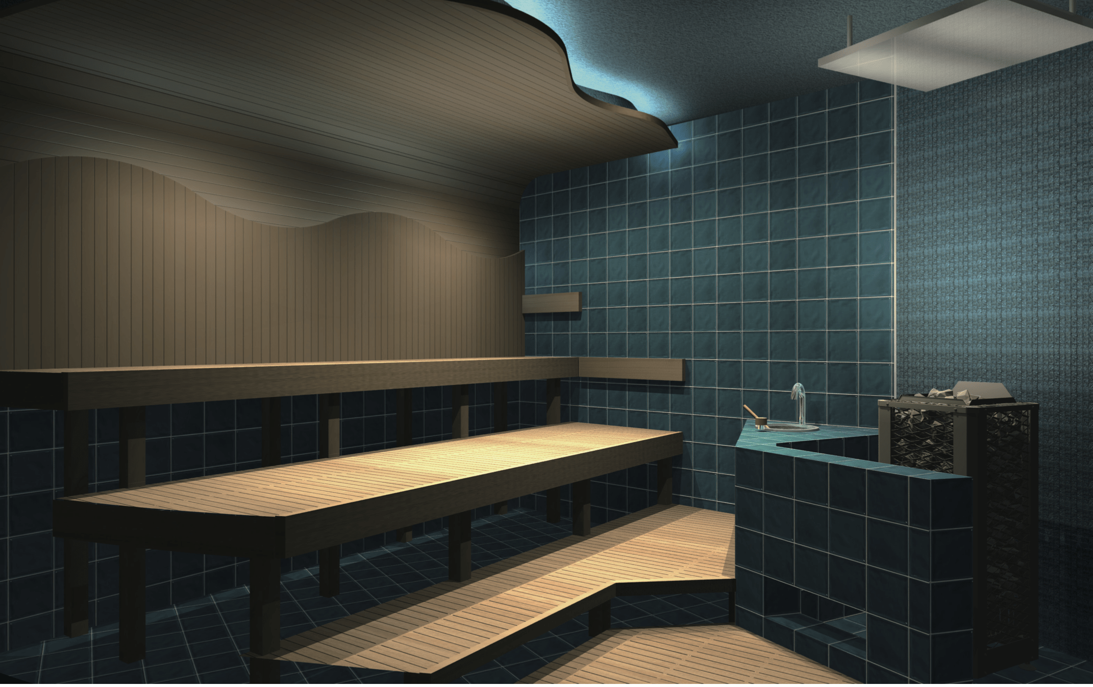 一方、女性用サウナは、沖縄の伝統工芸やちむんと、青く広がる海をイメージした空間に。やさしい色合いと波を思わせるデザインで、穏やかに癒されるひとときを過ごせる設計です。