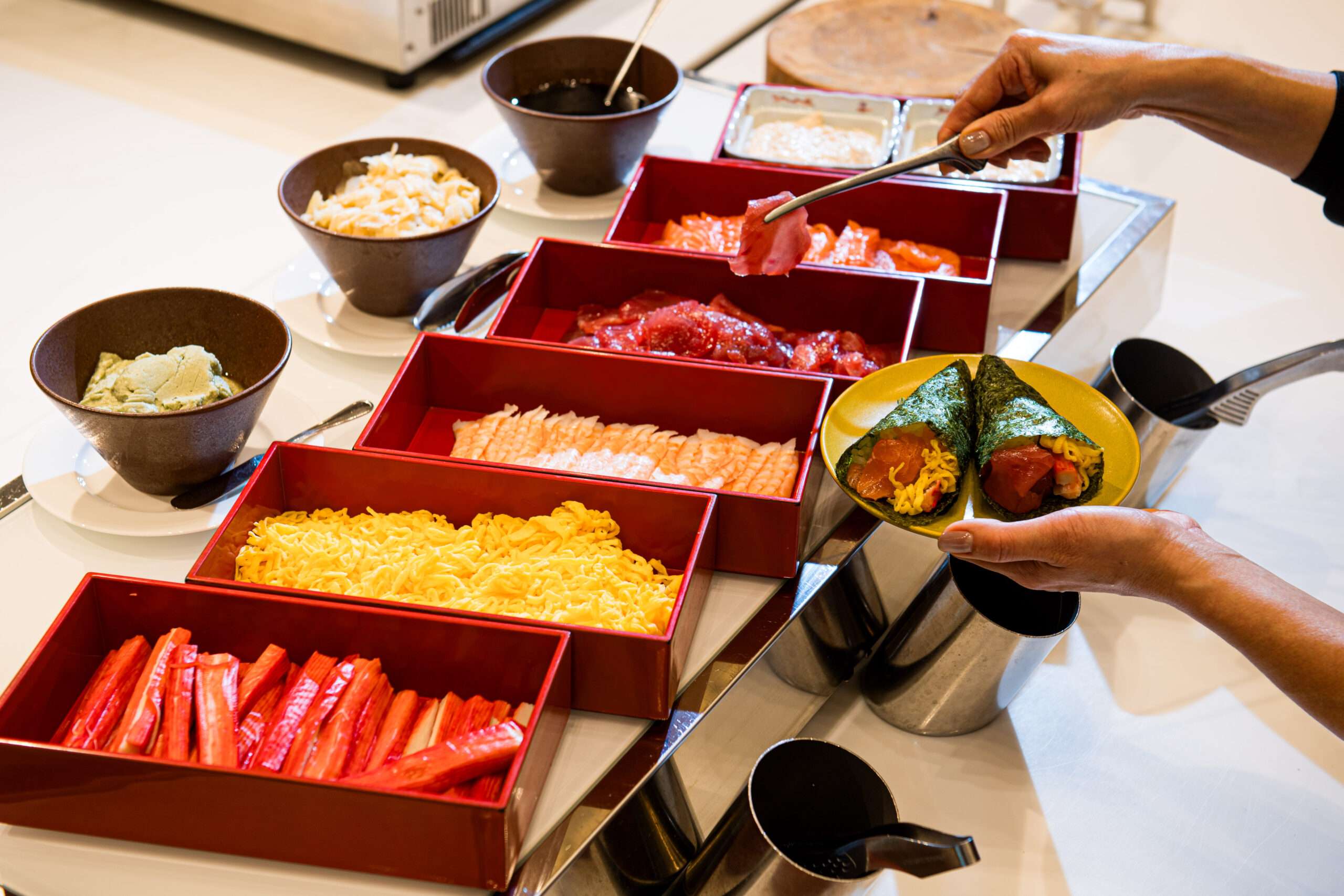 手巻き寿司やハンバーガーなど、好みに合わせてアレンジできる多彩なメニューを取り揃えている。