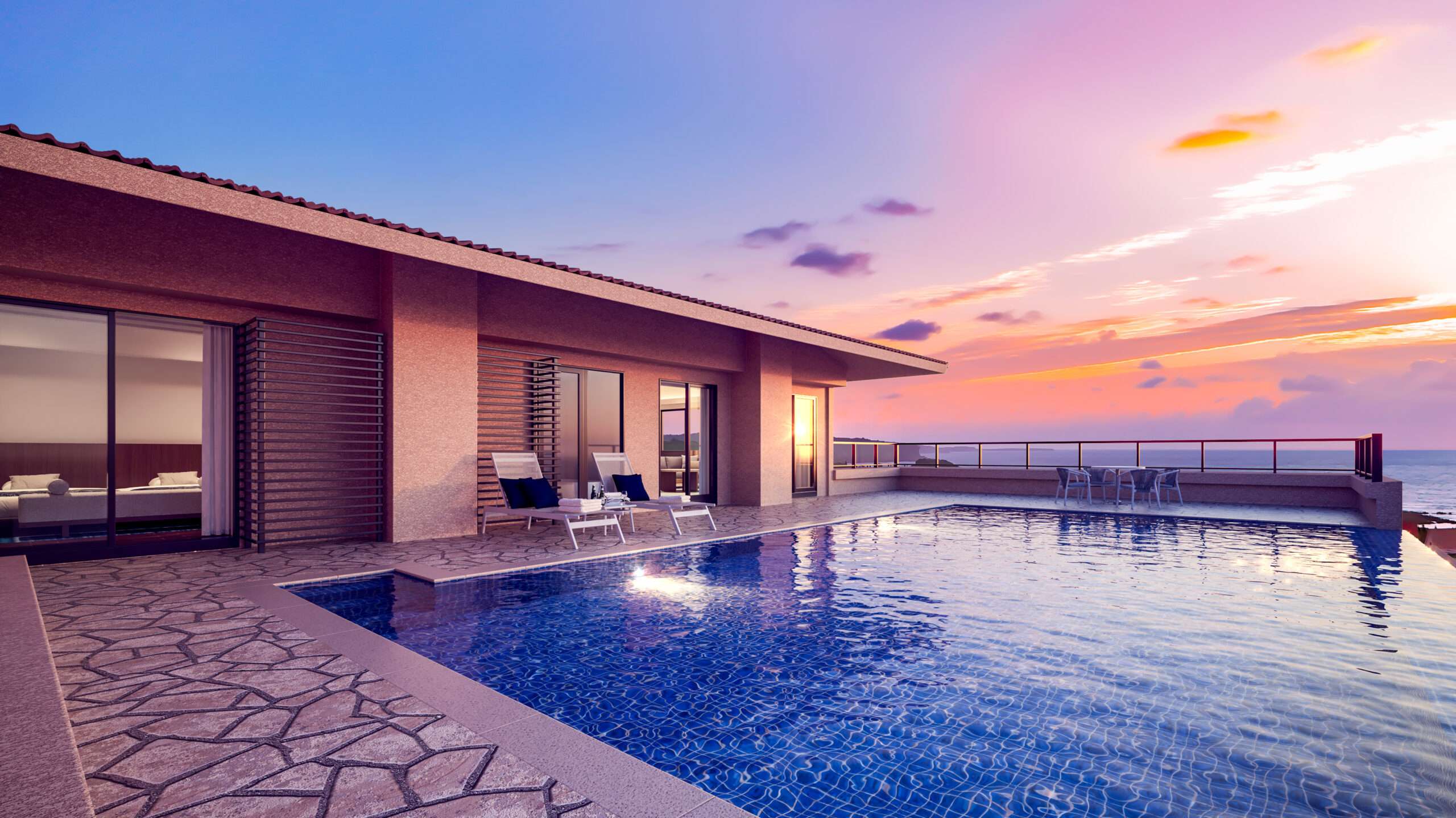 宮古ブルーの海とサンゴ礁を一望できるロケーションが特徴で、大人のためのプレミアムな滞在空間を提供する。