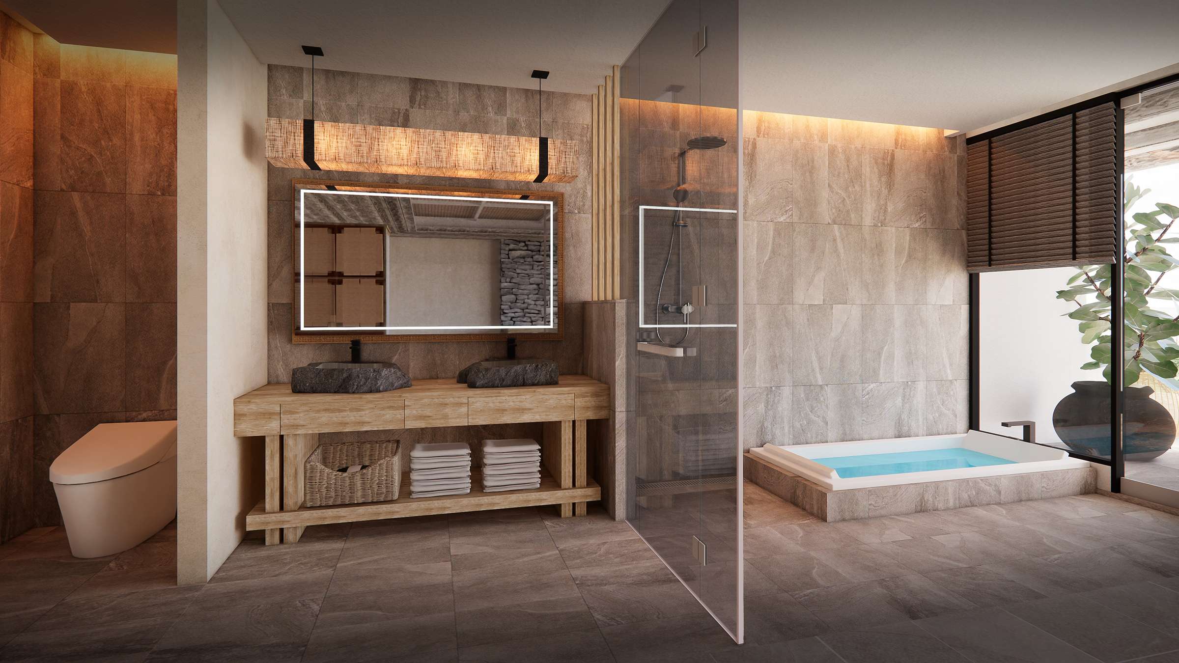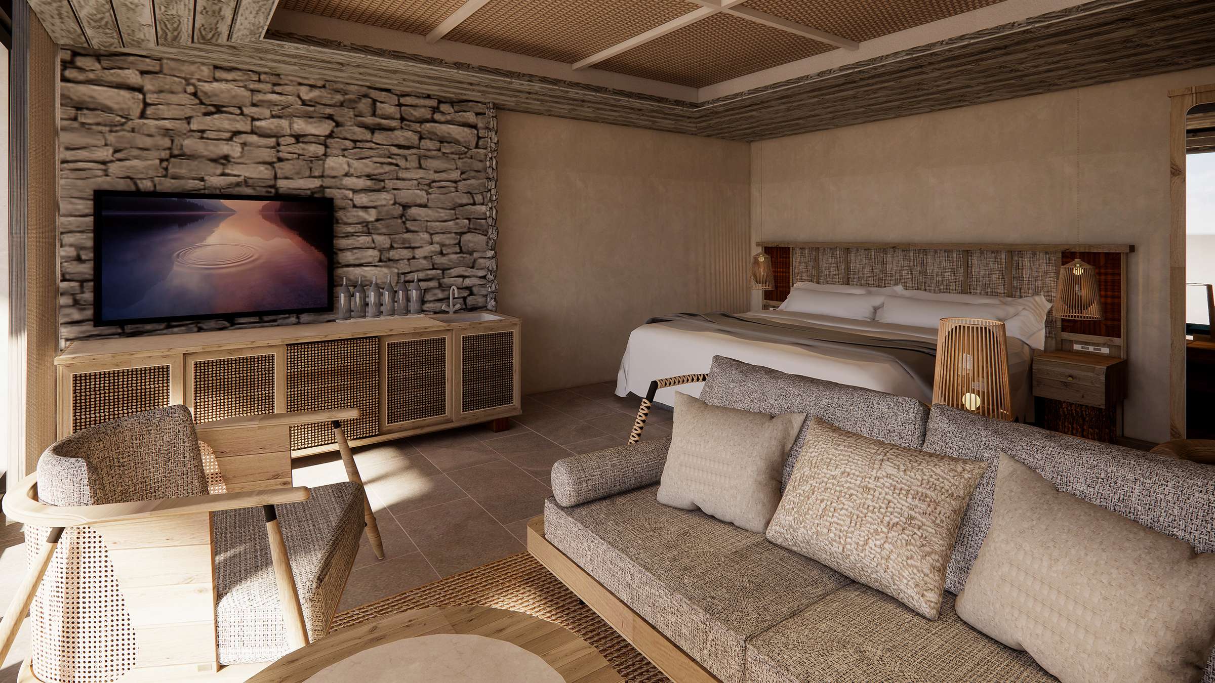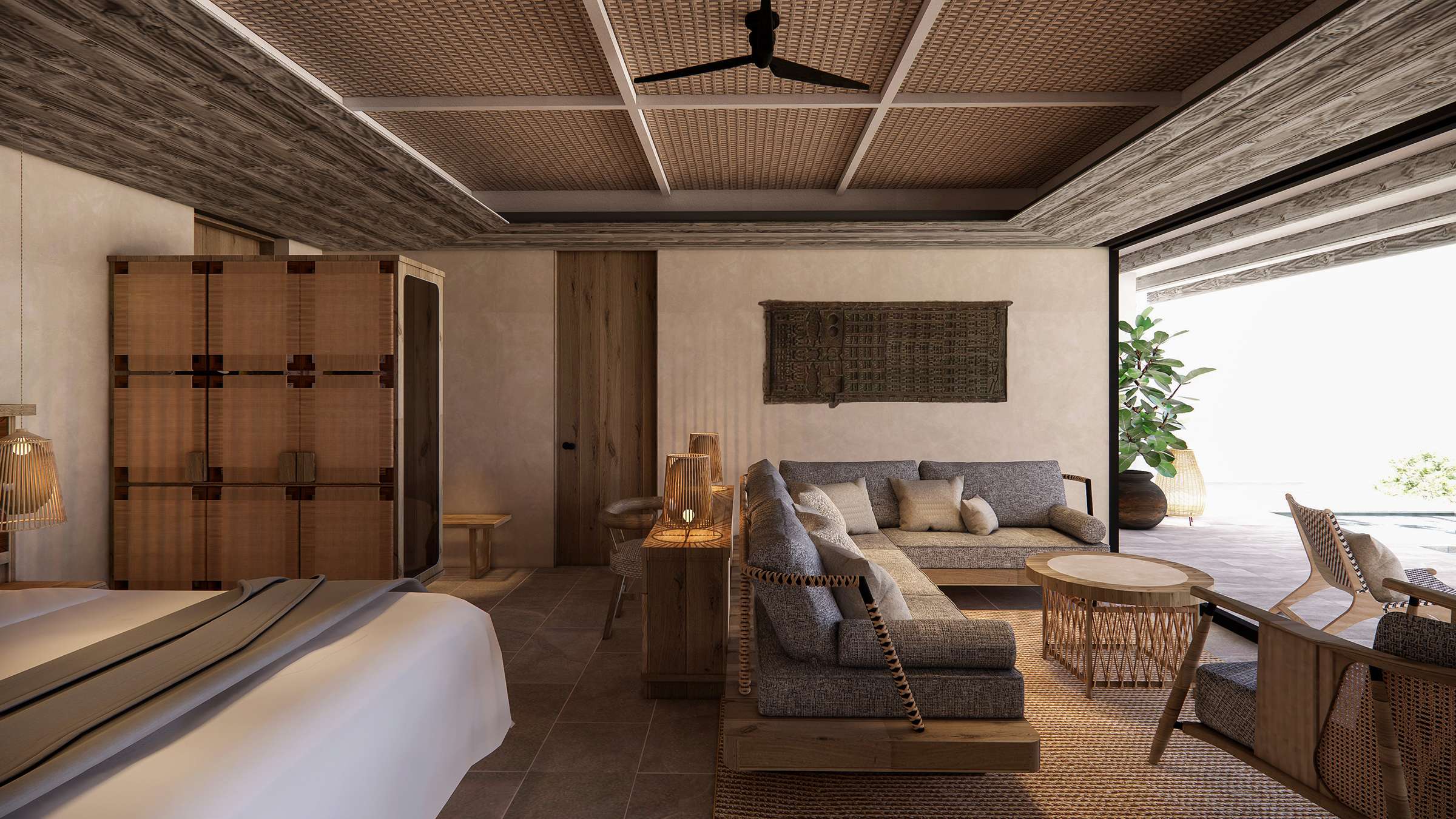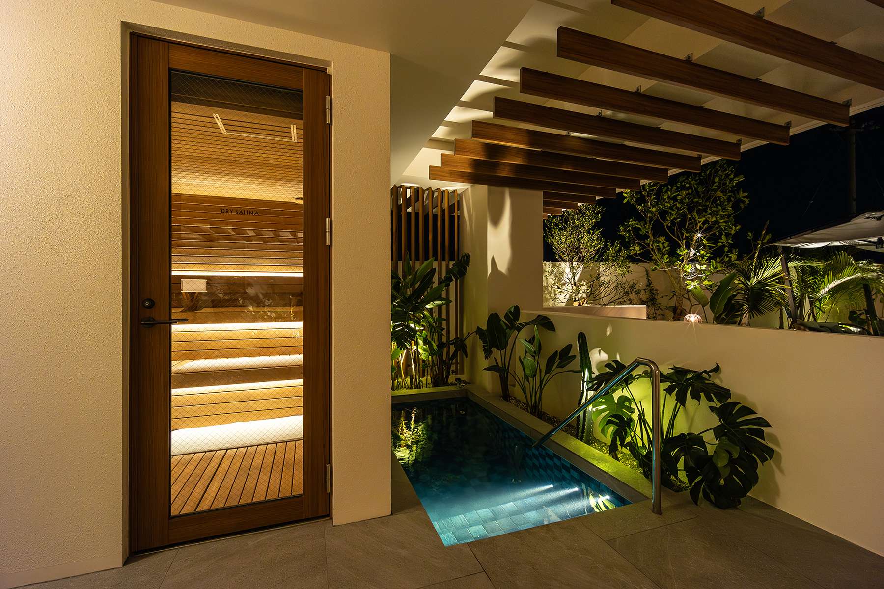 新ヴィラは北西向きの立地を活かし、春から夏にかけては水平線に沈むサンセットが楽しめるプライベート空間となる。各客室には専用のプライベートプールとサウナが完備され、広々としたリビングと木目調の落ち着いた内装が自然と調和した上質な寛ぎを演出している。完全なプライバシー確保のもと、大人の自由なリゾートステイが実現可能。
