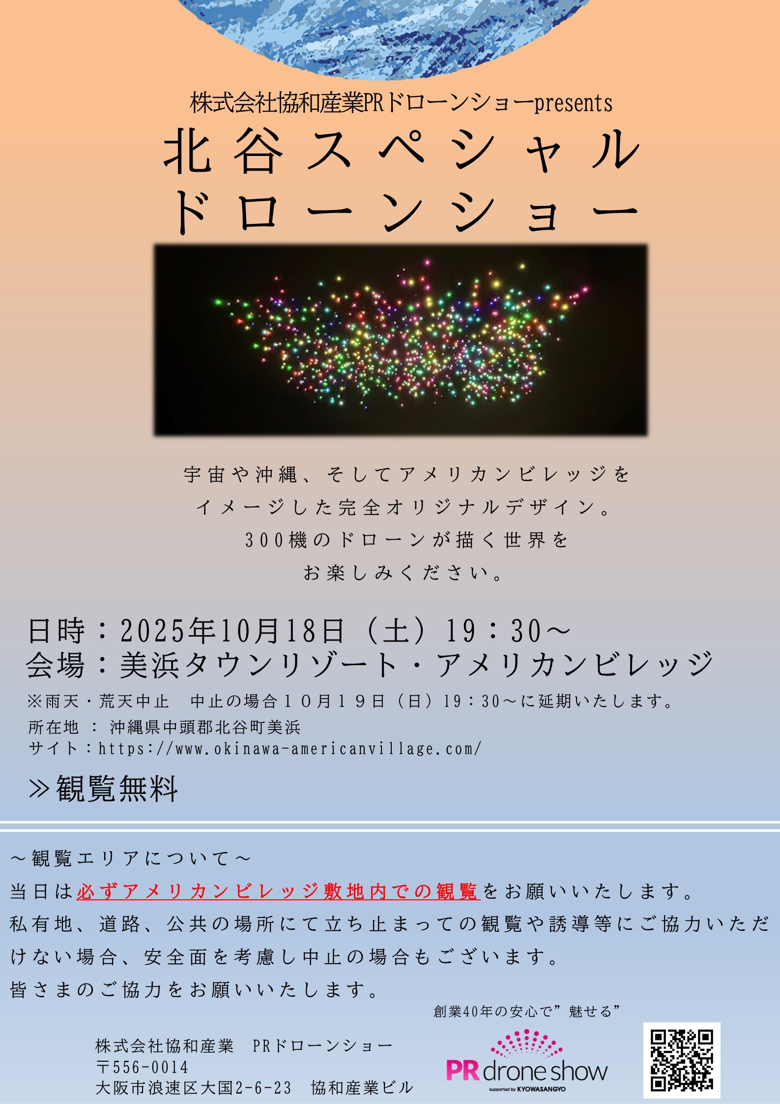 2025年10月18日、沖縄県北谷町アメリカンビレッジにて、株式会社協和産業が主催する「北谷スペシャルドローンショー」が開催されました。会場の夜空を300機のLEDドローンが彩る幻想的な演出に、多くの来場者が魅了されました。