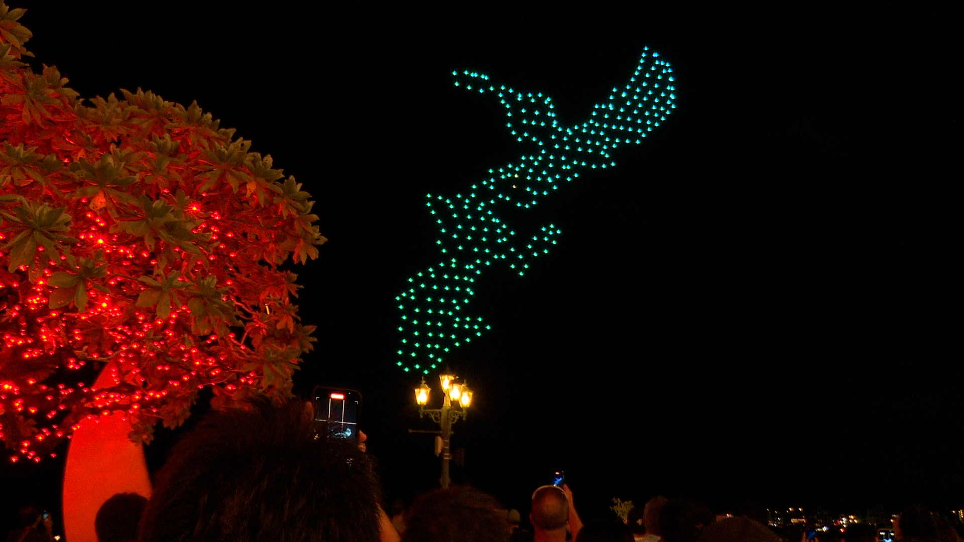 中でも注目を集めたのは、宇宙を感じさせる浮遊感あふれるシーンや、沖縄らしさを表現した花や地形のフォーメーション。幅広い世代が楽しめる構成となっており、北谷の夜空がまるで一夜限りのステージとなりました。