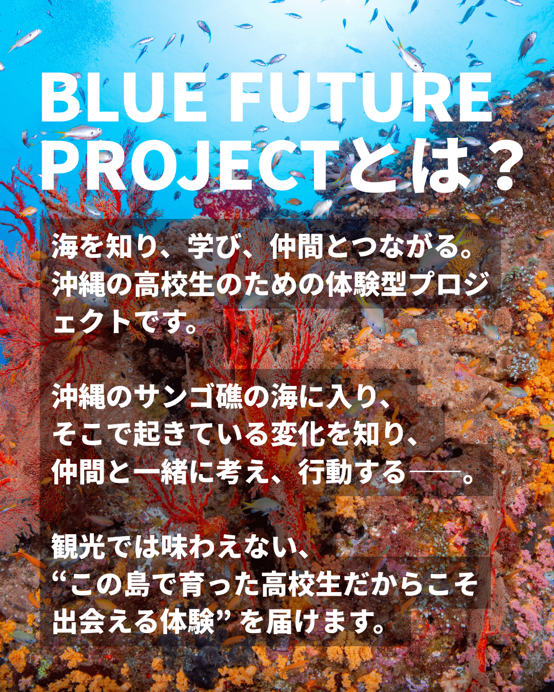 沖縄は世界有数のサンゴ礁に囲まれた地域ですが、県内の高校生の調査では9割以上が「海でサンゴ礁を見たことがない」と回答しており、身近な自然を体験する機会の少なさが課題とされています。本プロジェクトは、大学や社会に出る前の高校生がサンゴ礁の海を実際に体験し、環境問題を自分ごととして考えることができる機会づくりを目的としています。