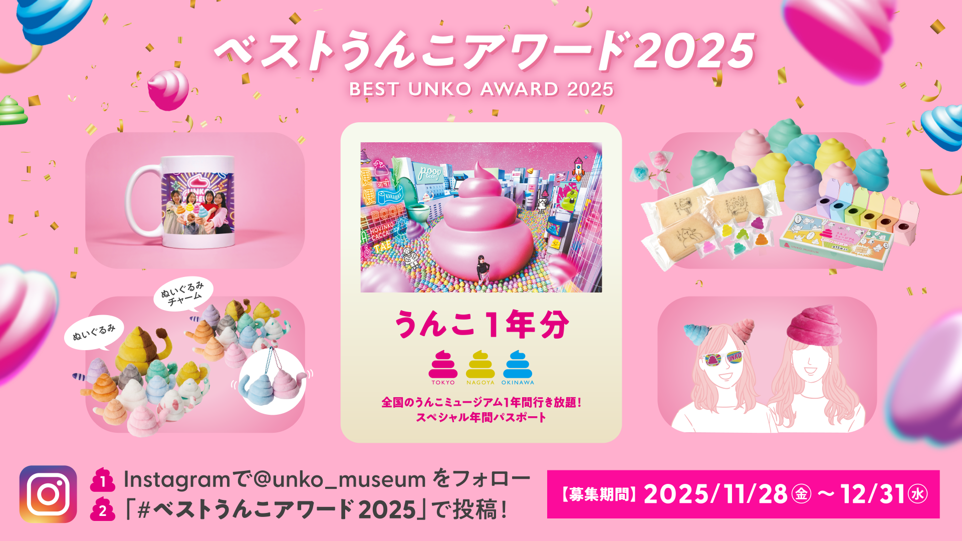 また12月31日まで「ベストうんこアワード2025」を開催しており、2025年に来館したお客様対象のInstagramフォトコンテストを実施しています。ベストうんこアワード賞やベストファミリー賞など複数の賞があり、受賞者には豪華な賞品が贈られます。応募は「TOKYO」「NAGOYA」「OKINAWA」各店舗で可能です。
