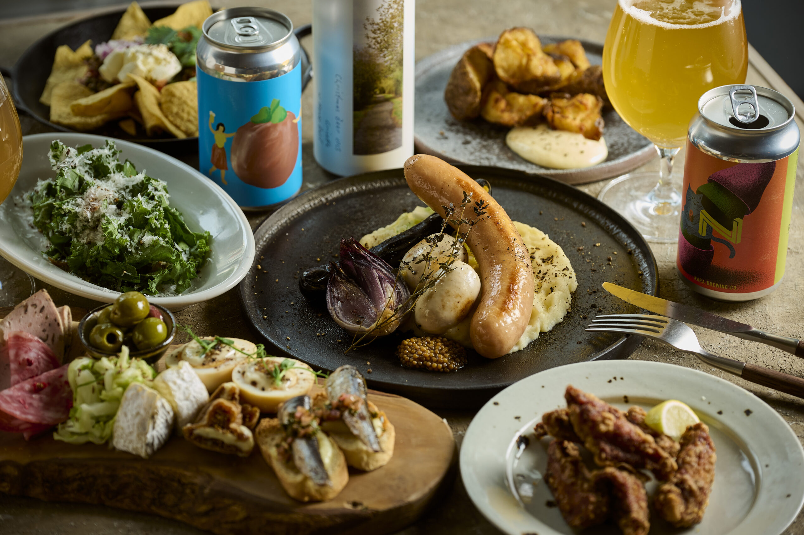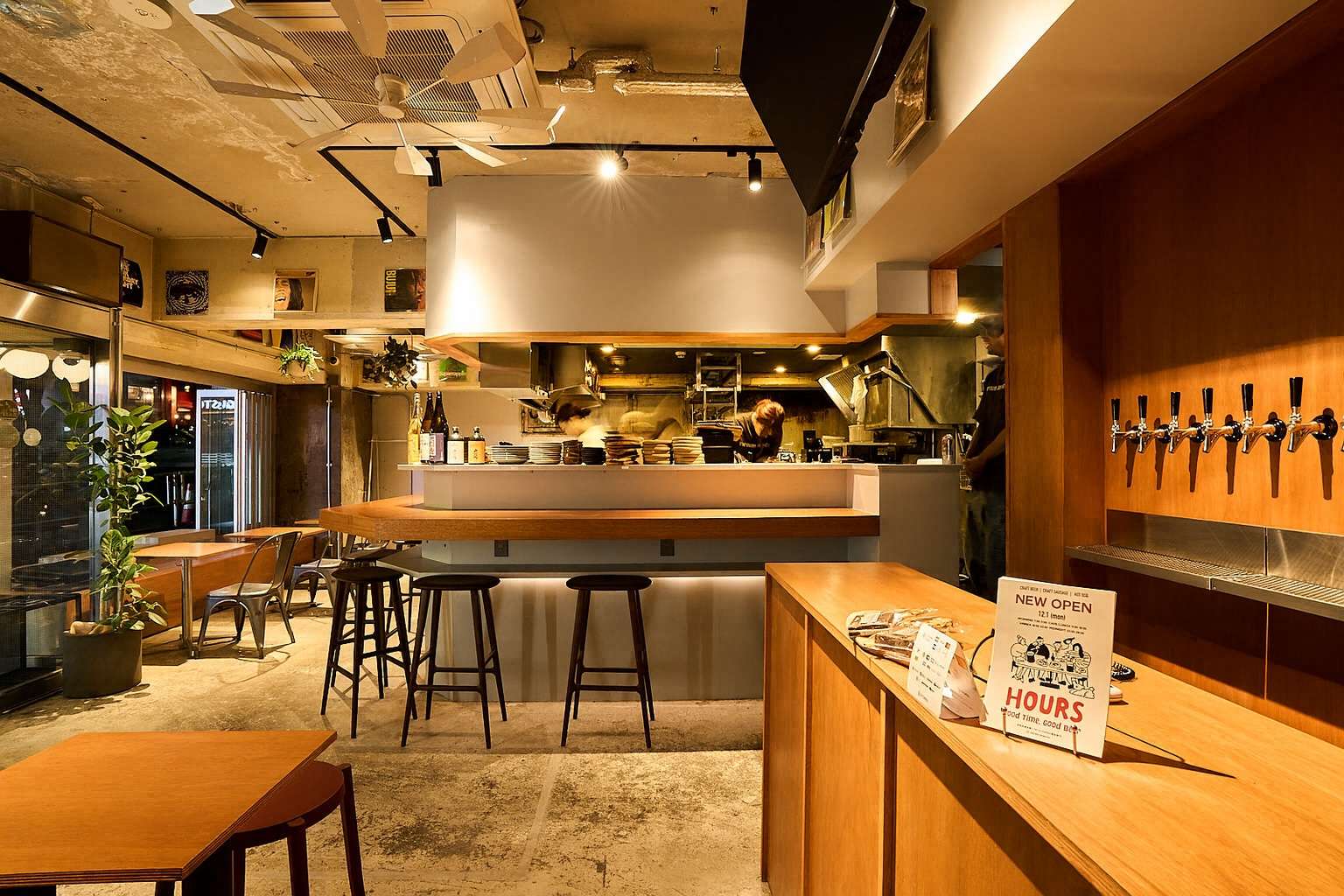 店舗の特徴には、まず朝7時から翌4時まで全時間帯でクラフトビールを提供することがあります。7種類のタップビールと約40種類の缶ビールを揃え、国産クラフトビールを中心に「食事に合う」ビールを厳選しています。HOURSオリジナルのレモングラスを使用したラガーもあり、看板メニューのポーク×レモングラスソーセージと相性抜群です。タップのラインナップは定期的に入れ替わります。