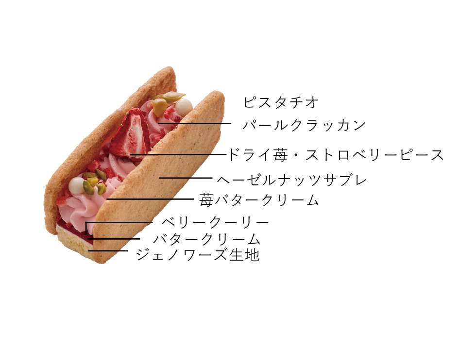 ヘーゼルナッツ入りのサブレ生地で、ジェノワーズやバタークリーム、フルーツソースを贅沢にサンドしたお菓子。