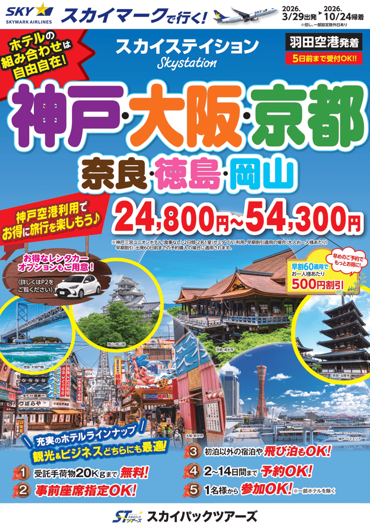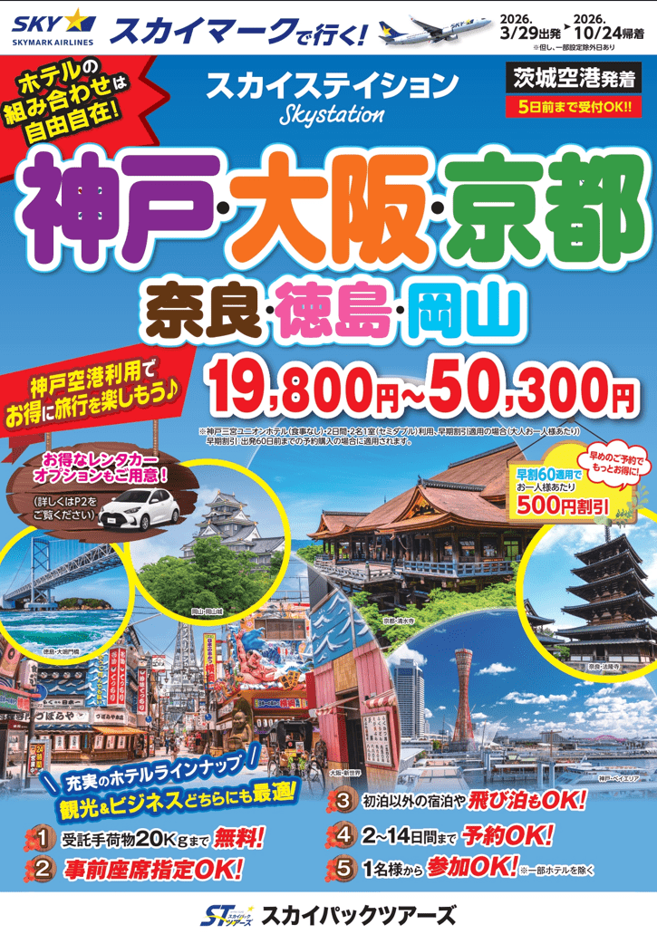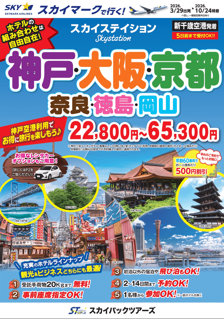 スカイパックツアーズ株式会社は、スカイマークの航空券とホテルがセットになった「たす旅」において、神戸空港就航20周年記念クーポンキャンペーン第2弾の販売を開始した。