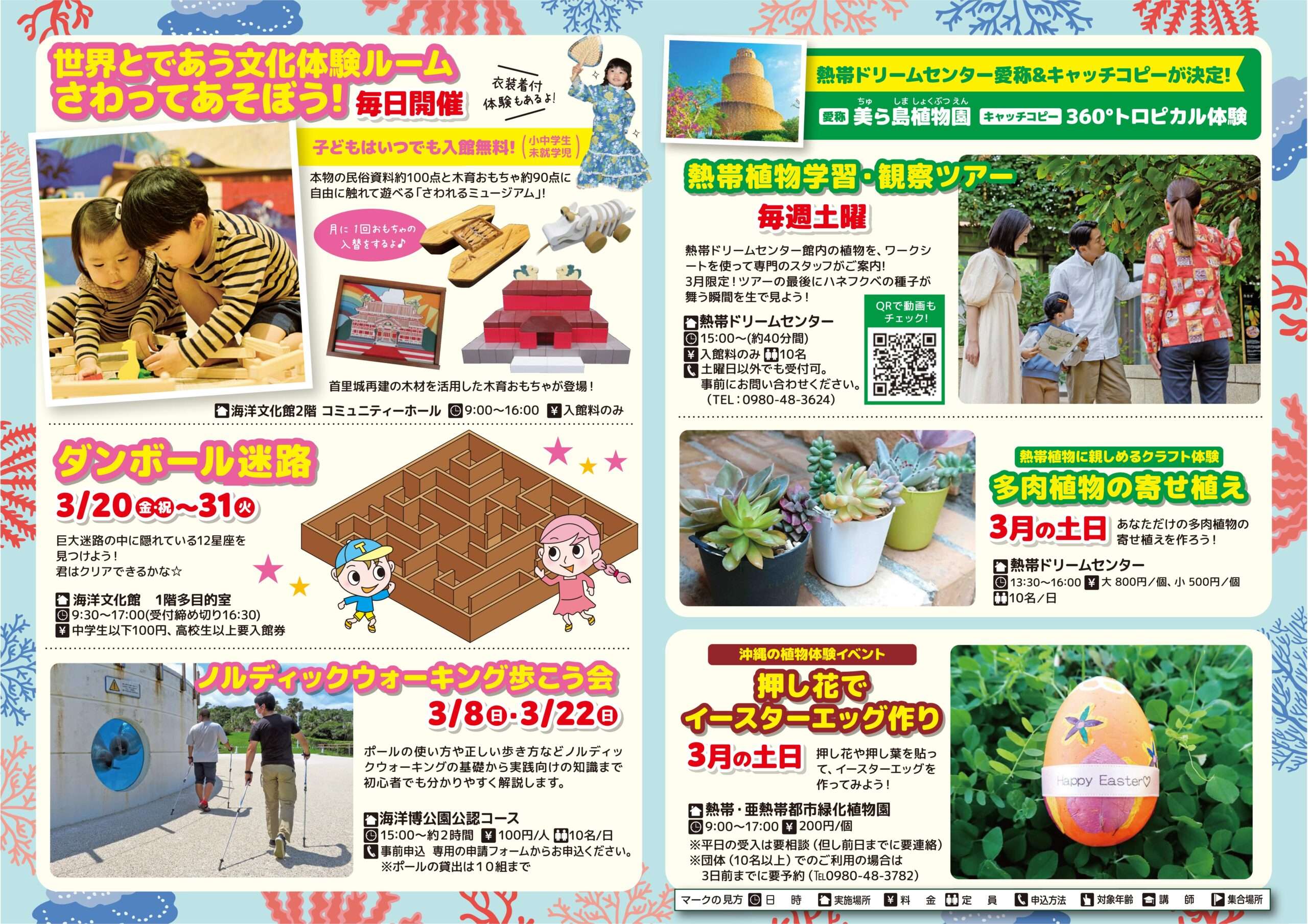 春休みを控えた3月、海洋博公園は学びと遊びが融合した充実のプログラムを展開する。水族館のサンゴ学習から植物園のワークショップまで、幅広い世代が楽しめる内容となっており、家族での行楽に最適。地域の自然と文化を一度に体験できる公園の魅力を、この機会に改めて体感してほしい。